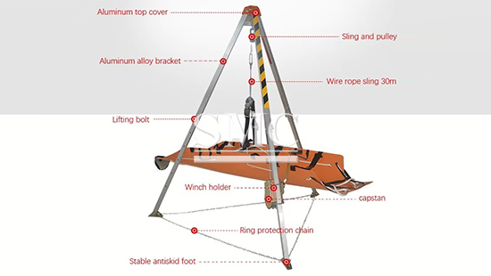 As a professional rescue equipment, the Rescue Tripod adopts a high-strength lightweight alloy made extendable support foot system, equipped with lifting and lowering self-locking devices and special stainless steel wire ropes. The safety factor of this equipment is greater than 10, the rated load is≤1.6KN, the steel cable length is up to 32 meters, and it is suitable for high-altitude, cliff and underground rescue scenarios.